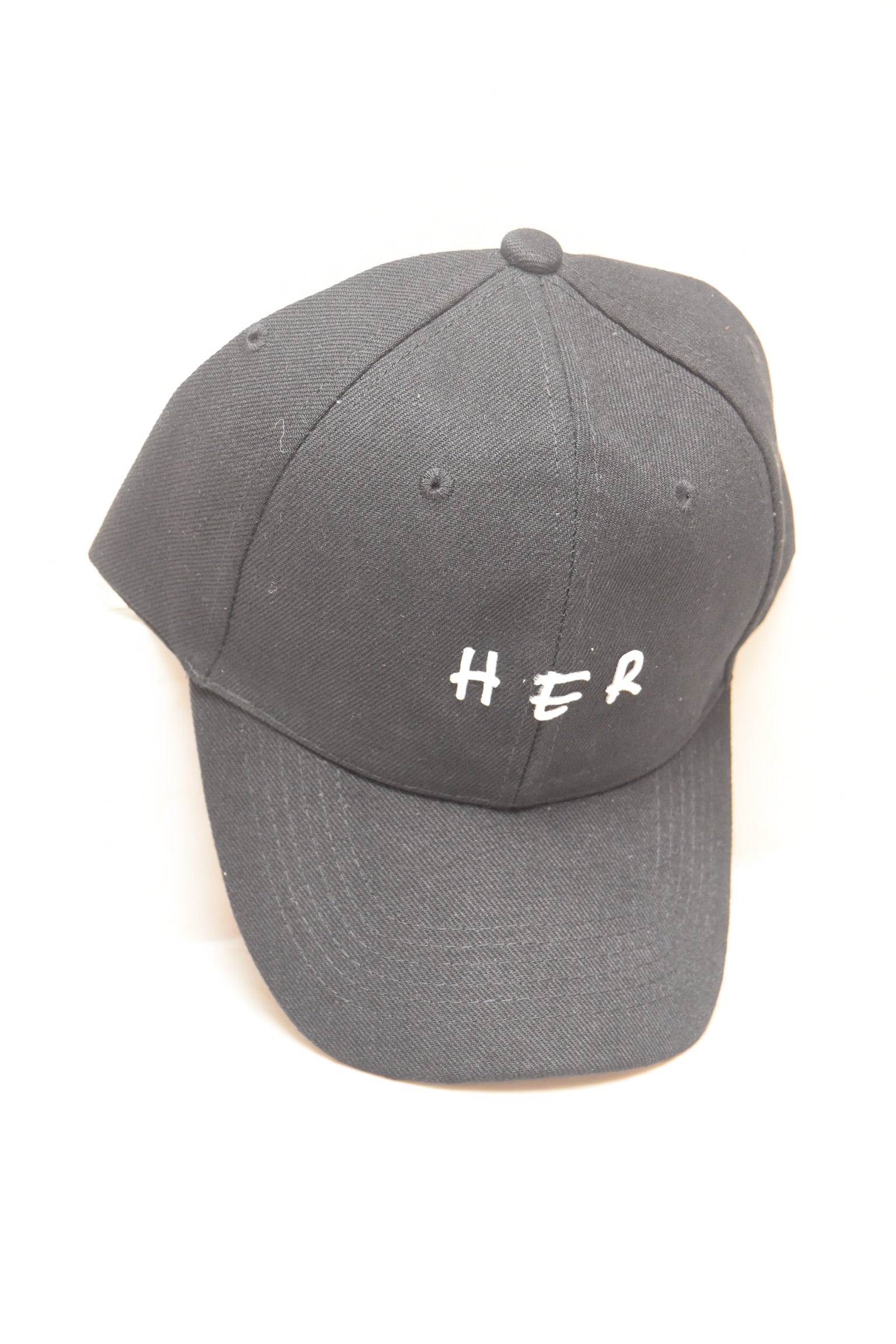 HER baseball cap. Comes in two different colors. Black with white lettering & white with white lettering. One Size